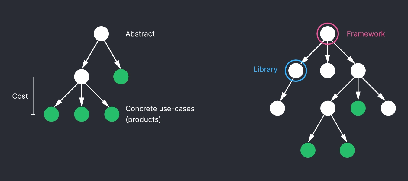In the software development world, the top node can be an abstraction like a framework, e.g. React or AngularJS. Moving down the layers means incorporating specific plugins or libraries to fulfil certain features. The end goal of developers is to reach the leaf nodes, which are the actual products/apps that the software engineers want to deliver to their customers or clients.