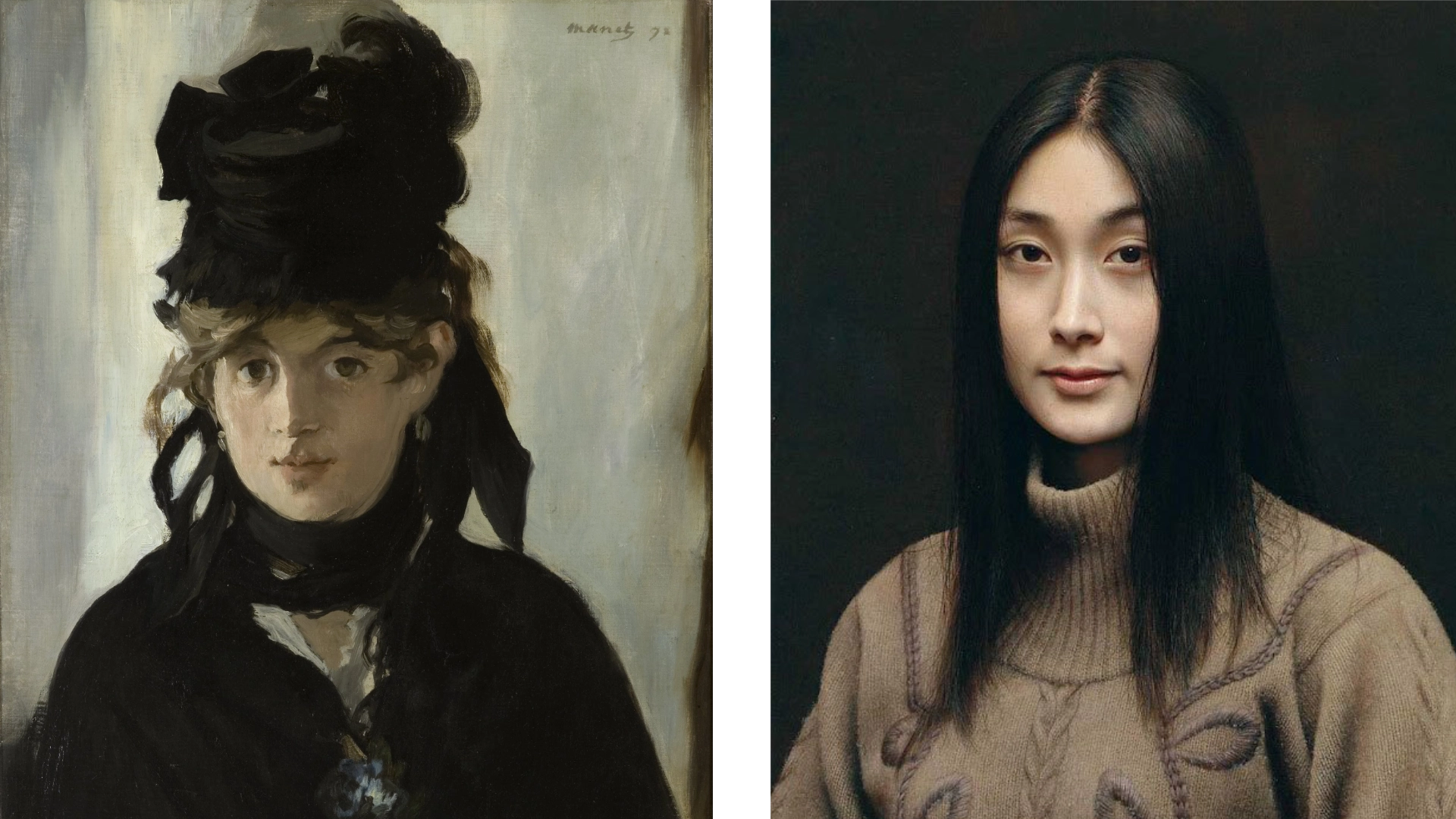 Fig.2: Levels of abstraction in art. On the left is Edouard Manet's "Berthe Morisot with a Bouquet of Violets" in an impressionist style. On the right is a hyper-realistic painting from Leng Jun, entitled "Mona Lisa."
